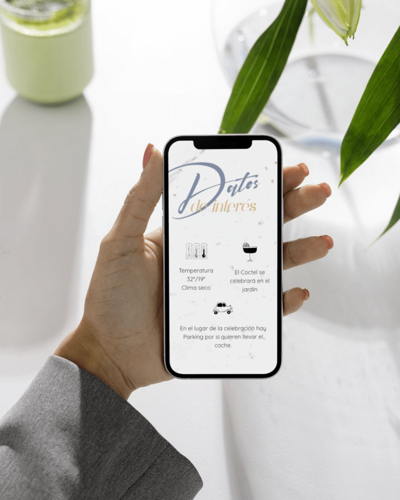 Incluye todos los detalles clave del día del evento: accesos, estacionamiento, clima y dress code (indicaciones de vestimenta), además de contactos importantes como el/la wedding planner, para que tus invitados lo tengan todo claro.